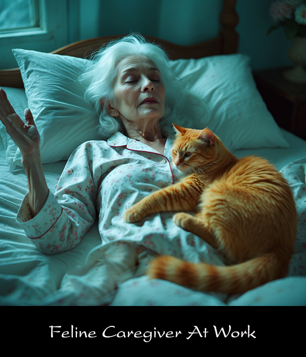 While we were sitting there frustrated, her orange cat calmly walked up and sat on her stomach and looked down at the area which hurt the most. The pain immediately lessened and within 5 minutes all of my wife’s symptoms had vanished. I could sense that the distress was gone and there was no malign spiritual activity left. The cat stayed on her stomach for about another hour and then moved down to sleep between her legs.